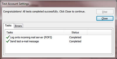 11. The “Test Account Settings” will run to test the feasibility of the send/receive operation via your configured account. If the tests complete without error, click “Close”.