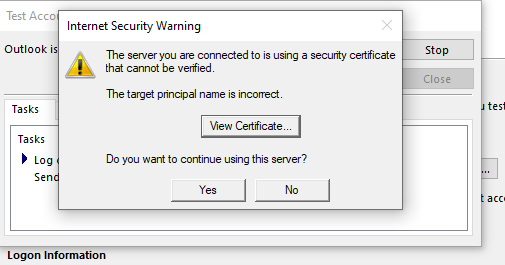 If you do not want the warning to always display on the mail client startup, we suggest to change the mail server to our generic mail server address. Otherwise, you can opt to get an SSL certificate for your mail server. If you have any enquiries, please contact helpdesk@lookafter.com for more details.