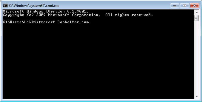 4. On the command prompt, type tracert yourdomain.com where yourdomain.com is the domain name for which you want to perform a traceroute. (E.g. tracert lookafter.com)