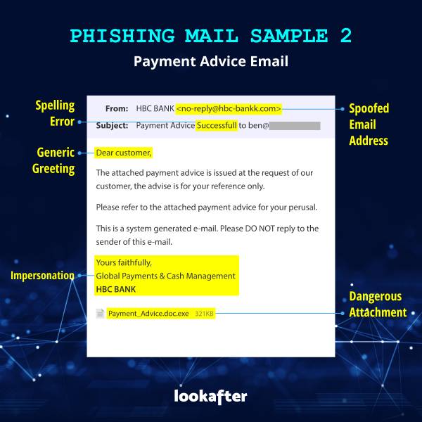 Payment advice email scams may come with dangerous attachments. These attachments can contain malware, such as viruses, ransomware, or other harmful software, which can compromise your computer or steal sensitive information.