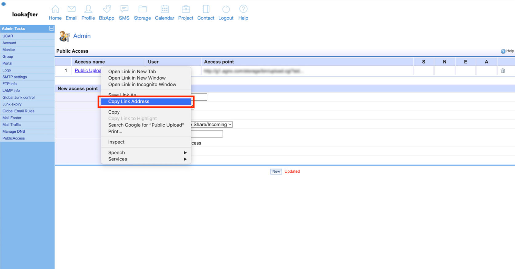 9. You will see a public access point created and available in the “Public Access” list. Right-click “Public Upload” and select “Copy Link Address” to copy the public upload link.