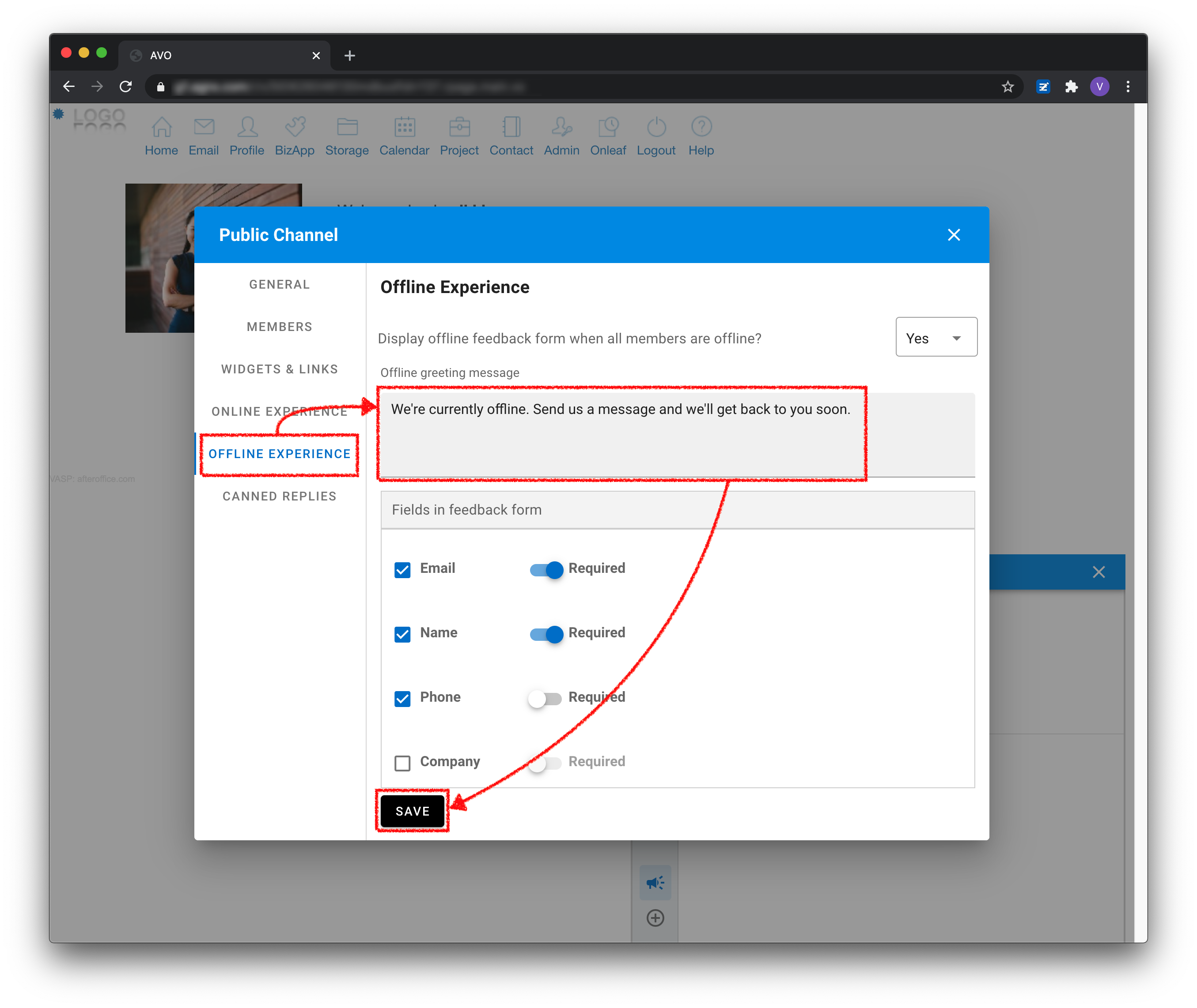 If none of the operators is online, the visitors will see the offline message on the chat widget. To change this message: