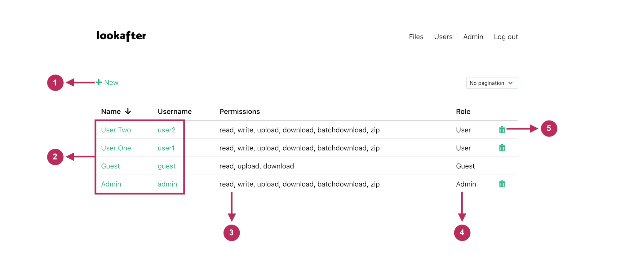 | 2 | Name & Username (of users) | Clicking on a user's name or username will launch a pop-up screen that allows the admin to edit the user's password, role, permissions, home folder and more. |