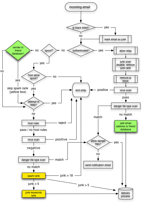 The chart below illustrates how the incoming email traffic being handle at VO SMTP server.