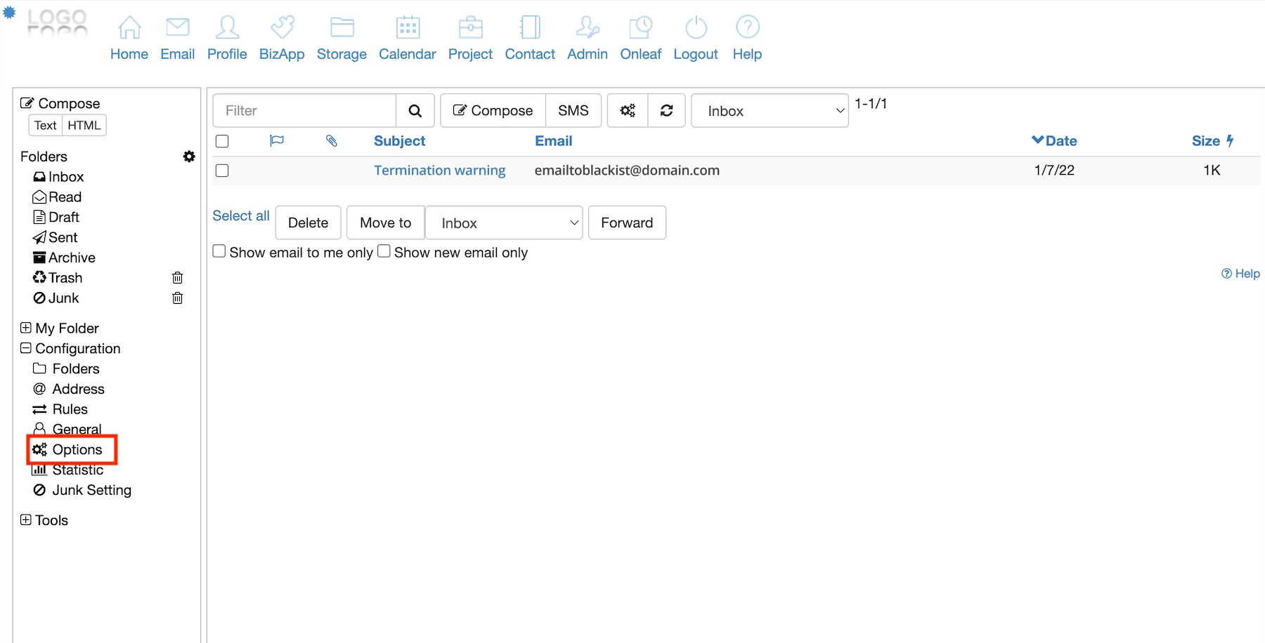 1. On your webmail, select Options (under Configuration).