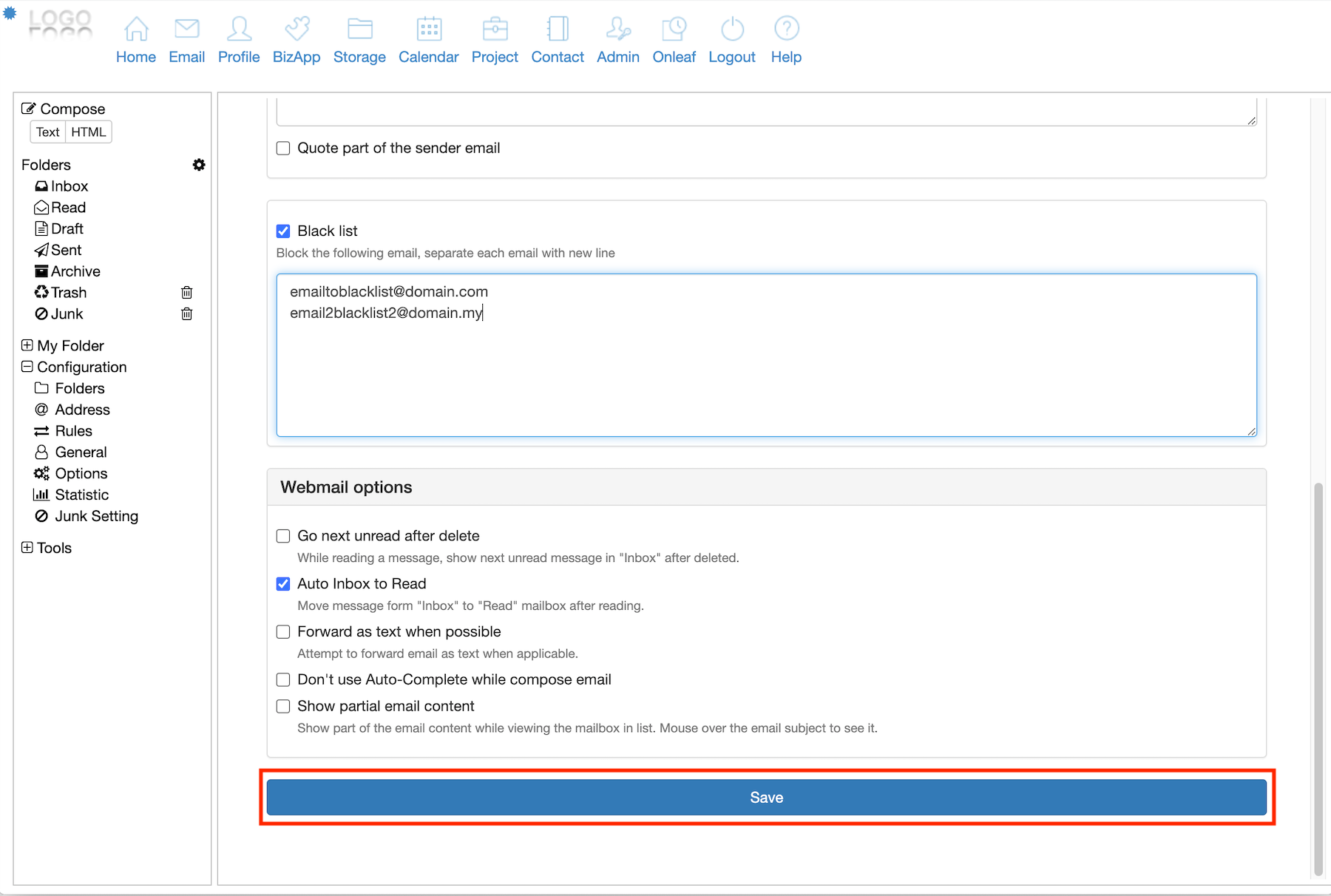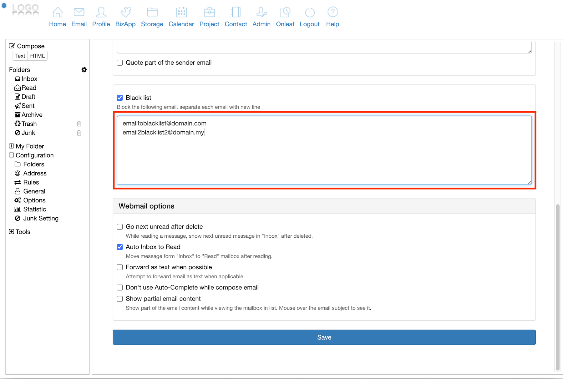 3. Key in the email address that you want to blacklist into the given field. If there are more than one email address, separate them with new line.