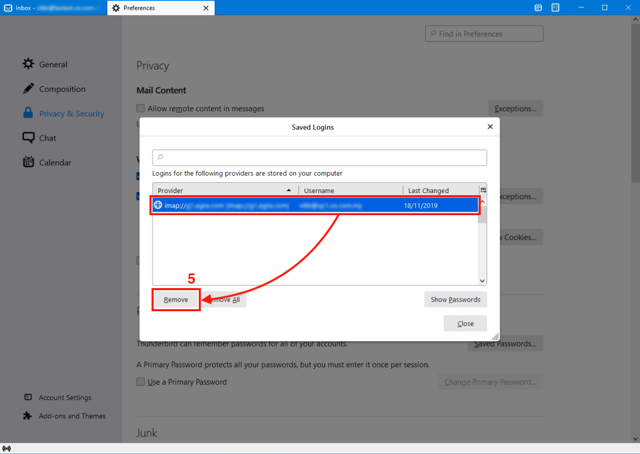 5. On the pop-up window, select your IMAP or POP profile and click on the Remove button.