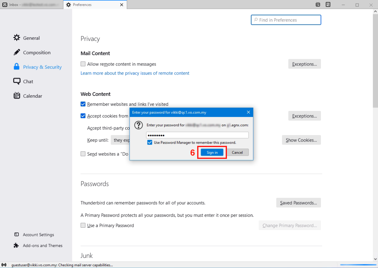 6. Then, close Thunderbird and relaunch it. Once you restarted Thunderbird, it will prompt for the new password. Just enter the new password, and make sure to select the “Use Password Manager to remember this password” option, and click Sign In.