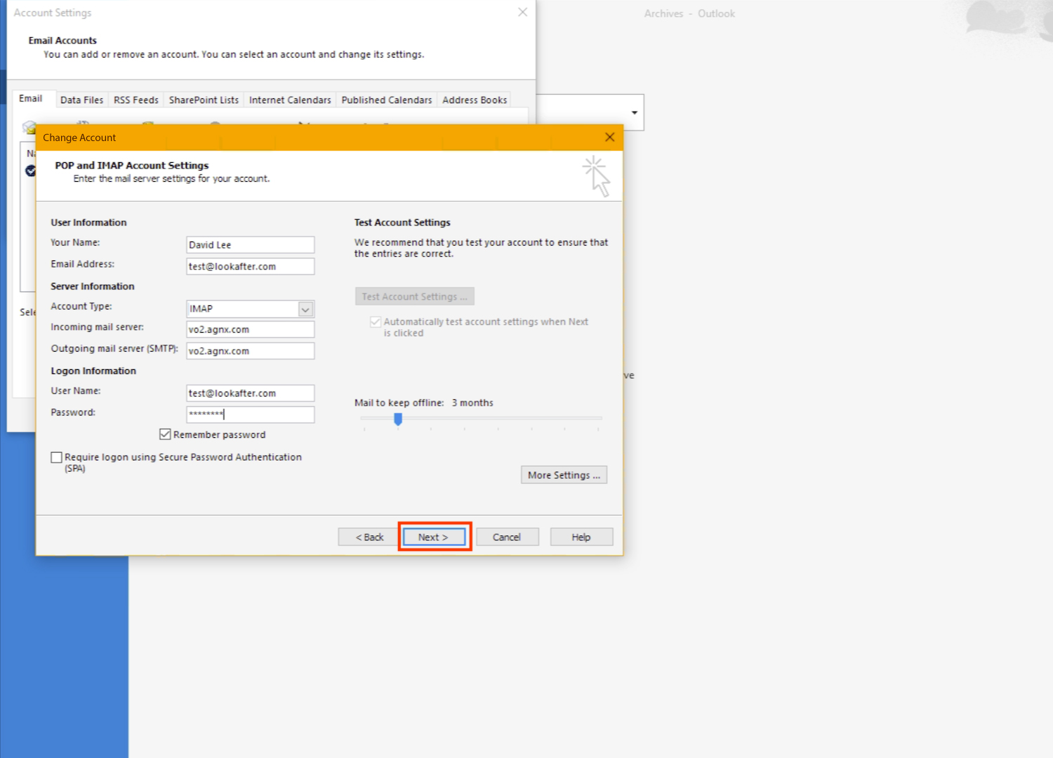 9. After checking on all settings, click Next for Outlook to test on the incoming and outgoing connections.