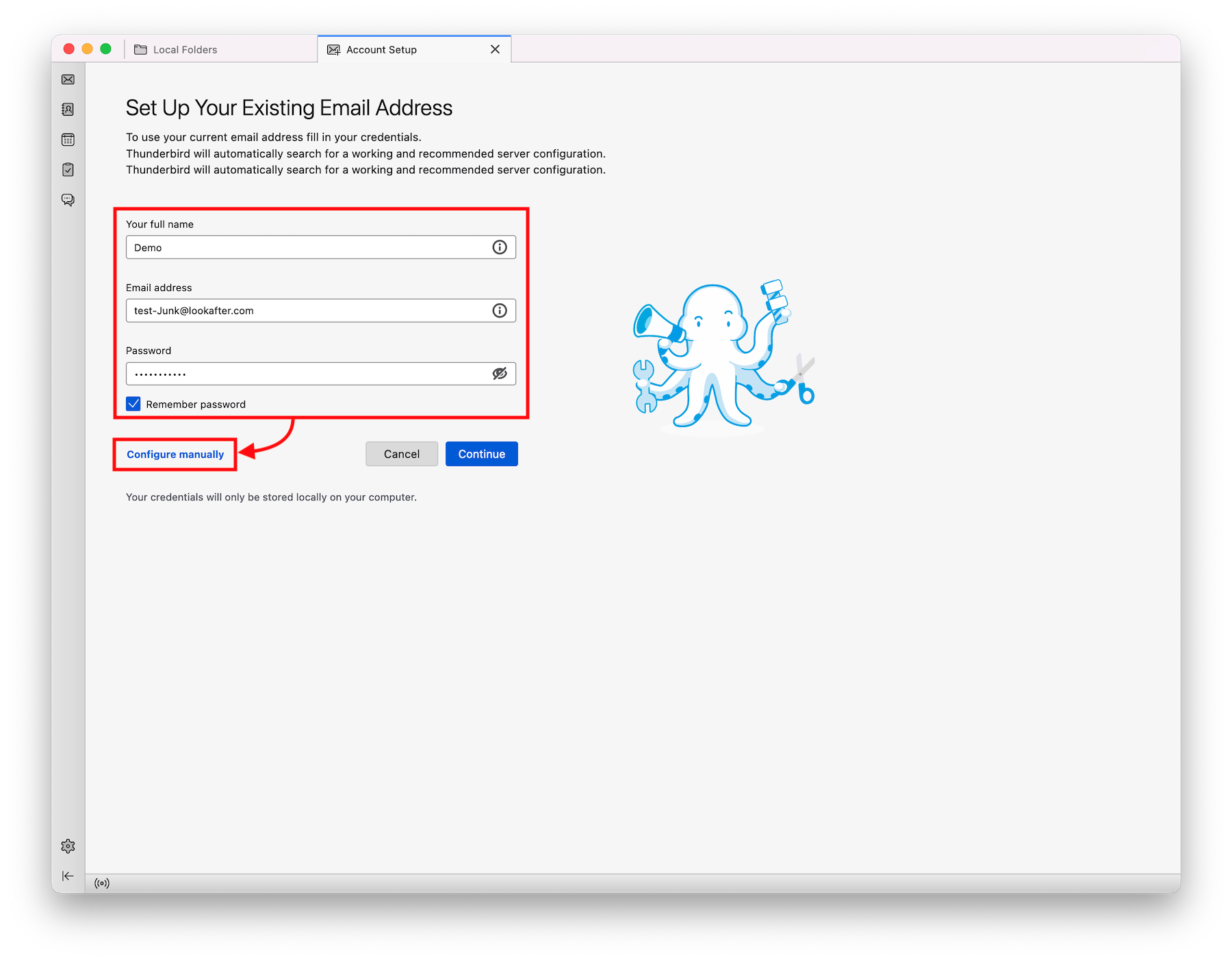 Remember to tick the “Remember password” checkbox. Then, click Configure manually.