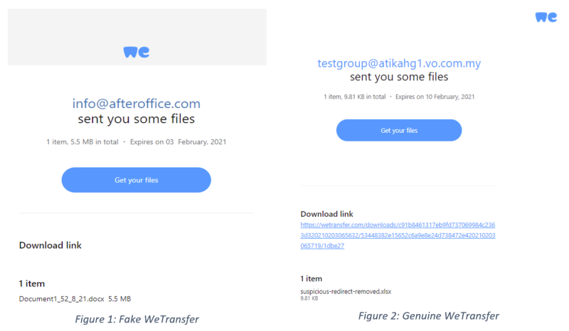 Both figures above show the example of fake and genuine WeTransfer email. Here, you can see that the content for these two emails is extremely similar. There are numerous version of fake WeTransfer email. So, if you are not be cautious enough, you may get trick by this and jeopardize your account’s security.