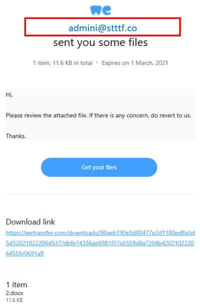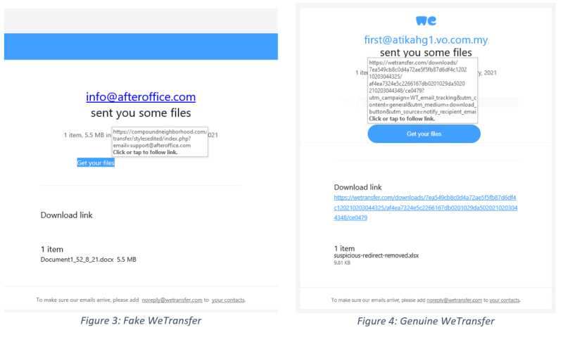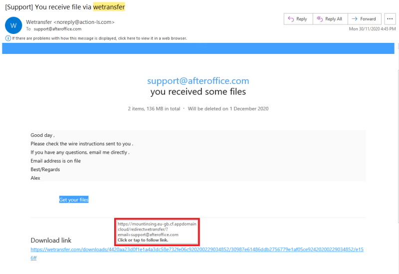 On top of that, there is case where the download link is written as https://wetransfer.com…. However, if you hover over the link, it will show you a totally different link as shown below.
