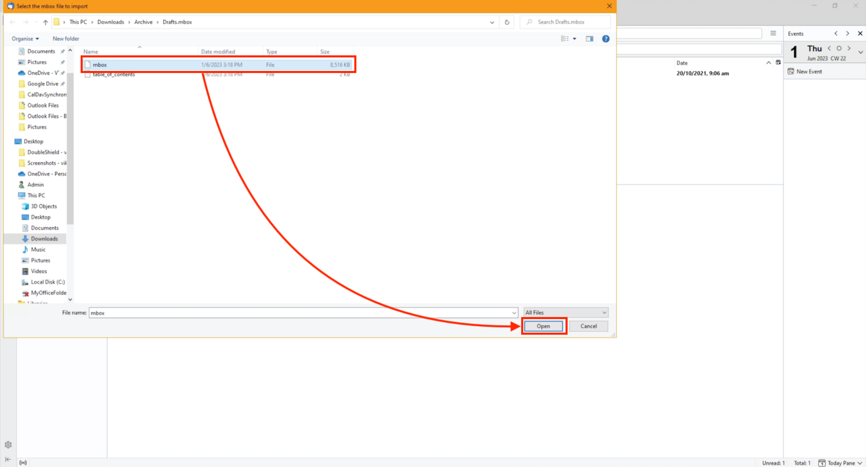 8. From the folder directory, navigate to the folder location that contains the mbox file you wish to import to Thunderbird. Select it and click Open.