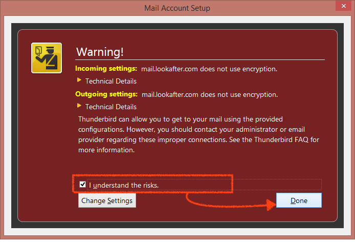 If there is warning message popped up, check [I understand the risks.] and click [Done] to finish your setup.