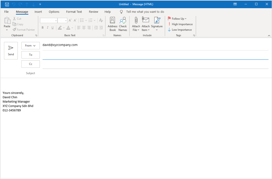8. Please note that Ms Outlook doesn't add your new signature to the message you opened in Step 1. Please close the first new message window, and open a new one to see your saved signature.