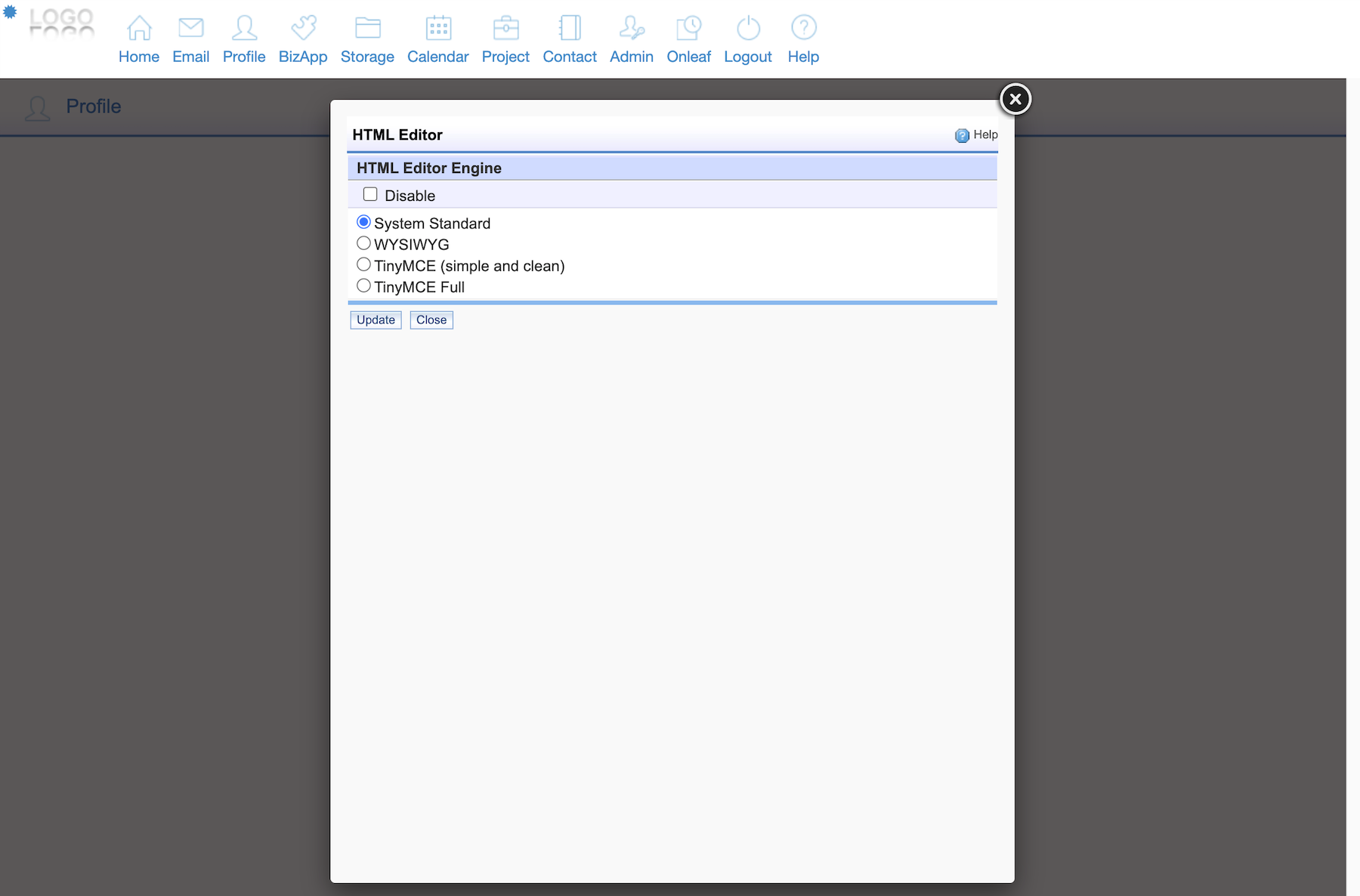 3. A “HTML Editor” window will be displayed. You can select any of the editors available: System Standard, WYSIWYG, TinyMCE (simple and clean), TinyMCE Full.